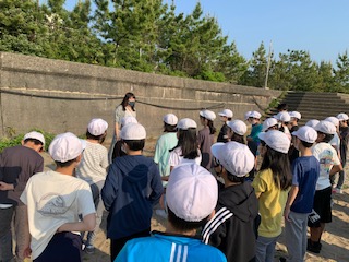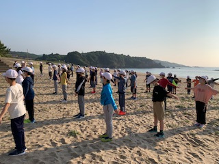 朝の会を浜辺でしました。さあ、今日も楽しい思い出をいっぱい作りましょう。