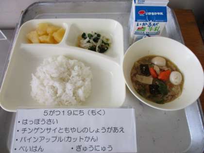 今日の八宝菜には、豚肉、うずら卵、たまねぎ、キャベツ、にんじん、たけのこ、ピーマン、しいたけと、なんと、8種類!の材料が入っていて、目でも楽しむことができました。「うずら卵やった!」と給食室で、歓声があがっていました。