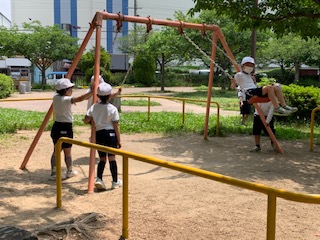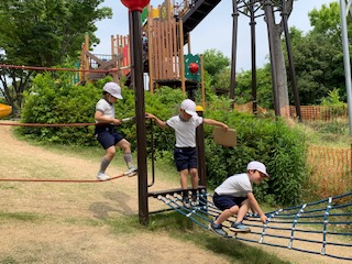 いろいろなアスレチック遊具やブランコで遊んでいます。みんな楽しそうです。