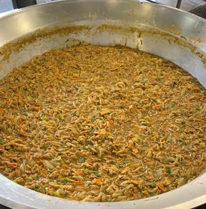 本日の和風カレー丼は、だし汁、豚肉、うすあげ、たまねぎ、にんじん、青ねぎ、しょうが、カレー粉にカレールウと調味料で、とっても具だくさん。姫里小学校の人数分で計算すると総重量は、約85kgです!!調理員さん1人で、大きなへらを使って混ぜていました。職人技すごいです!給食室にだしとカレーのいい香りがひろがっていました。