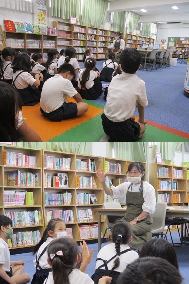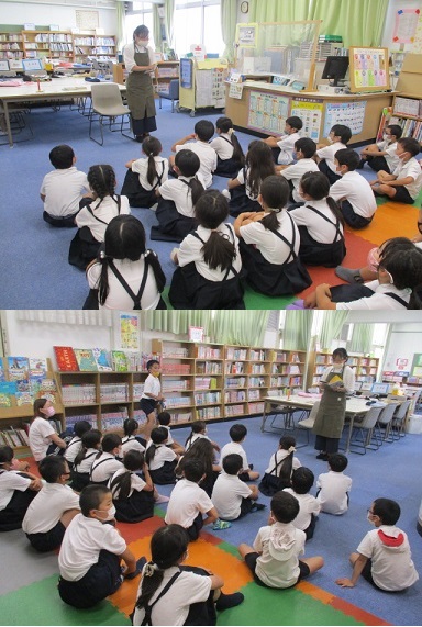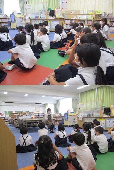 2年生が読書の会で、学校司書の先生から図書室で本の読み聞かせや本の紹介などをしていただきました。楽しい時間を過ごせたようです。
