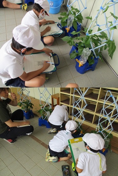 6月13日(月)1年生が育てているアサガオの観察をしていました。