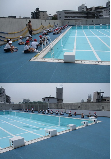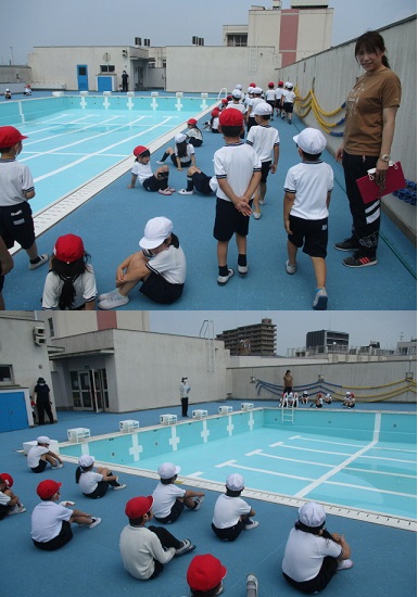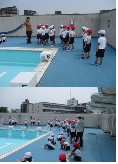 いよいよ来週からプール水泳が始まります。1年生がプールサイドで並び方や動き方の練習をしました。安全にプールに入れるよう、しっかり先生の話を聞いていました。