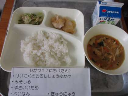 鶏肉のおろしじょうゆかけは、だいこんおろし、みりん、うすくちしょうゆを煮たタレを使用しています。だいこんおろしには、食べ物の消化を助けてくれる働きや、抗菌作用、食べ物の臭みを消す効果もあります。味もさっぱりで、ジメジメした今の季節にぴったりです。