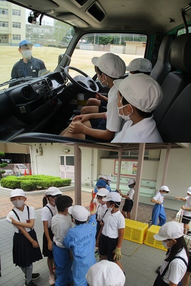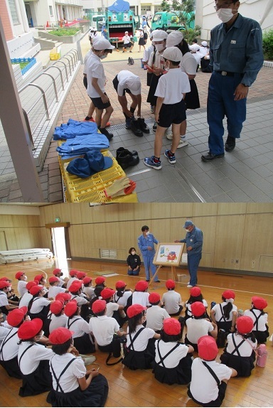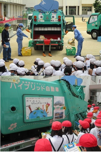 6月20日(月)4年生が出前授業で西北環境事業センターの方々に来ていただき、パッカー車体験をしました。パッカー車についてクイズに答えたり、乗車体験をさせてもらったり、作業着と安全靴の試着をしたり、パッカー車の種類やごみの分別について紙芝居で教えてもらったりしました。