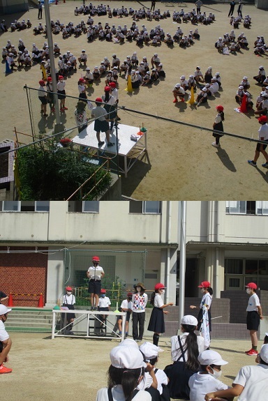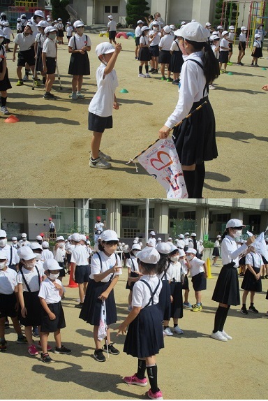 ひめっ子班ごとに一列になり、班長が少し離れたところに移動し、メンバーの児童がと順にジャンケンをします。
