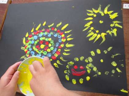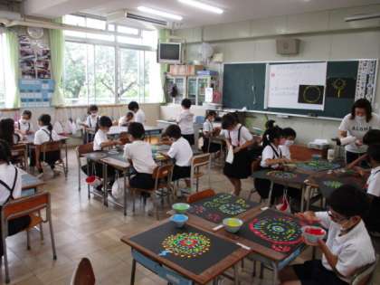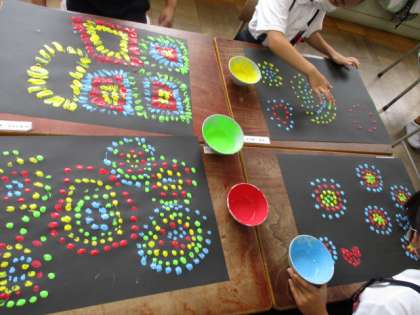 7月4日(月)2年生が図画工作科の時間に、「大阪の夜空を花火でいっぱいにしよう」というテーマで、とろとろ絵の具を指につけて、色とりどりの花火を描いていました。