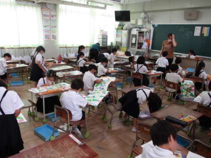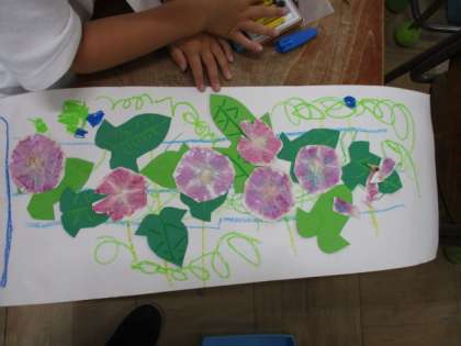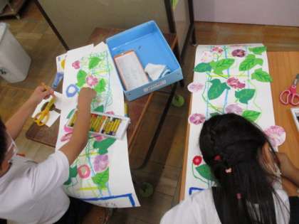 1年生が図画工作科の時間に、今、自分たちで育てているあさがおを描いていました。本物のあさがおの押し花も使っています。