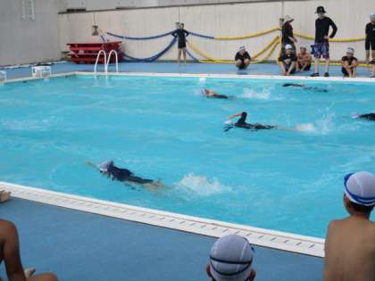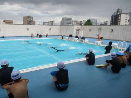 午前中に降っていた雨も上がり、6年生がプール水泳を行いました。今日は、コース別に練習したあと、泳力測定を行いました。まだ数回の練習ですが、ほとんどの児童が1回目より長く泳げるようになっていました。見ている子たちは、泳ぎ終わった友だちに大きな拍手を送っていました。