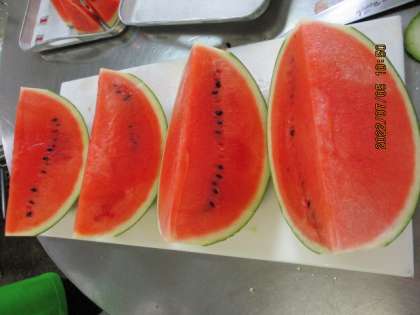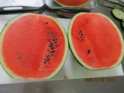 年1回登場のすいかの日です!調理員さんが手作業で1/64にカットしていきます。