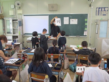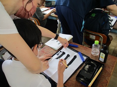 3年生が書写の時間に、毛筆で「川」という字に取り組んでいました。
