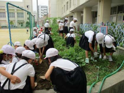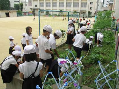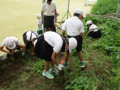7月8日(金)2年生が生活科でさつまいもの苗を植えました。今日は、みんなで畑に生えた雑草をぬきました。