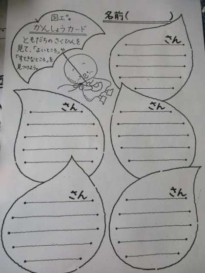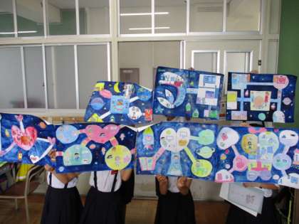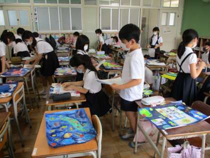 4年生が図画工作の時間に描いた「夢の宇宙ステーション」の鑑賞を行いました。机の上に並べられた作品を熱心に見ていました。作品を見終わった後は、ともだちのよいところ、すてきなところを鑑賞カードに書きこんでいました。