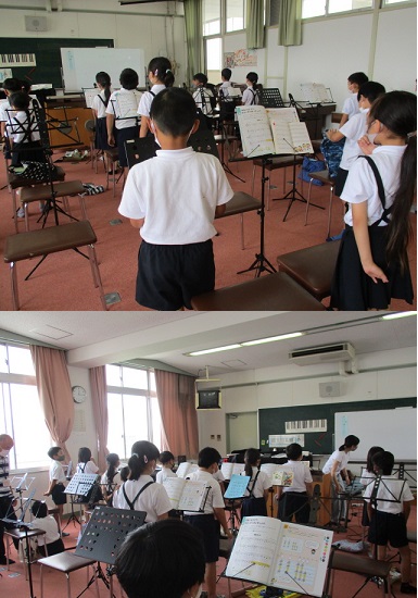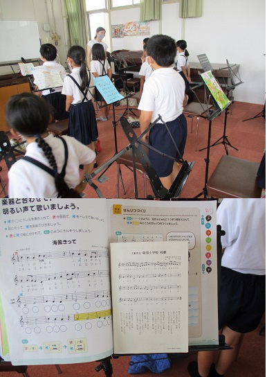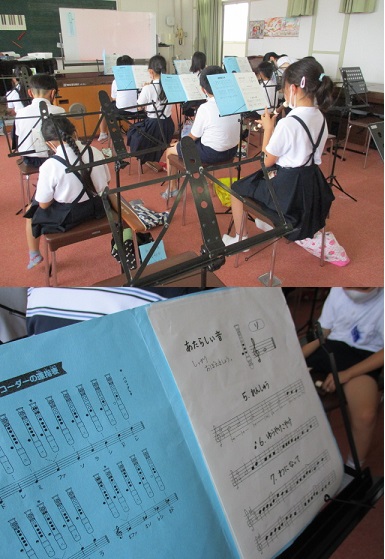 3年生がリコーダーで新しく「ソ」の音を練習しました。歌の練習では、「いつだって」「海風切って」を歌ったあと、校歌を歌って録音し、前に録音した校歌と聴き比べました。だんだん上手に歌えるようになっています。