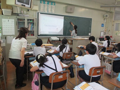 5年生が算数科の学習で、「間の数と子どもの数に目をつけて考えよう」というめあてで取り組んでいました。