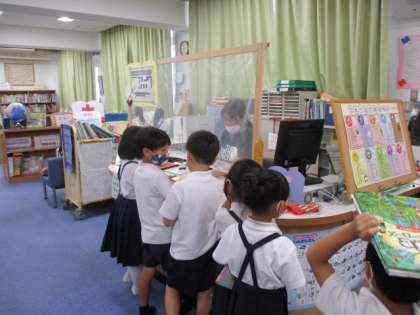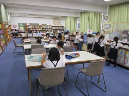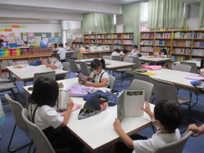 7/13(水)1年生が図書の時間でした。自分が読みたい本を選んだら、担任の先生にバーコードをスキャンしてもらって、借りる手続きをします。本を借りた後は、席に座って夢中で本を読んでいました。静かな時間が流れていました。