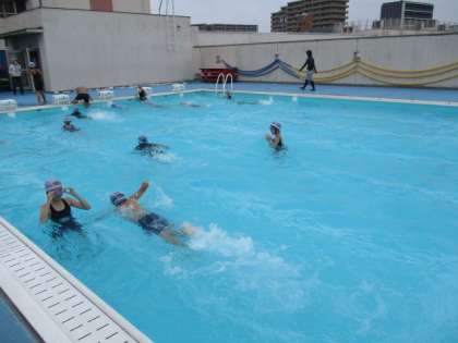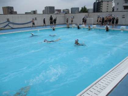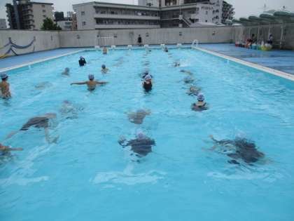 5年1組と3組がプールに入りました。水慣れのあと、25mをひとり2本ずつ泳いでから、泳力測定を行いました。どの子も、初めよりずいぶん長く泳げるようになりました。
