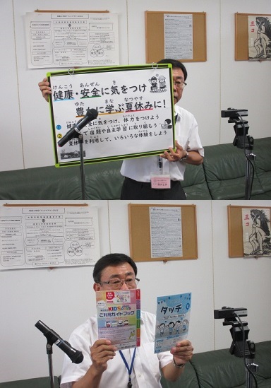 次に、明日から始まる長い休みに向けて「健康・安全に気をつけ、豊かに学ぶ夏休みに!」というめあてを発表し、具体的な取り組みとして次の3点を話しました。