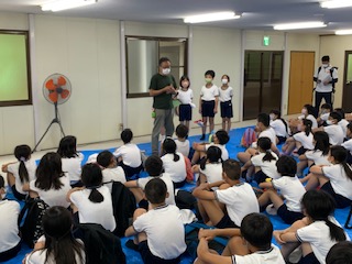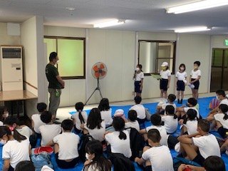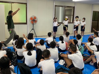 昼食の後、開舎式を森のホールでしました。宿舎の方にご挨拶をして、2日間の活動の気合いを入れるために、みんなで(エイエイオー)をしました。