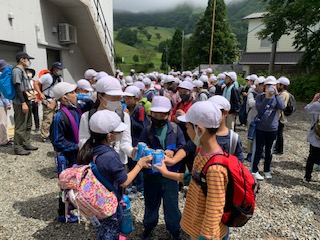 下山後は、宿舎の前で乾杯してジュースを飲みました。あー美味しい!