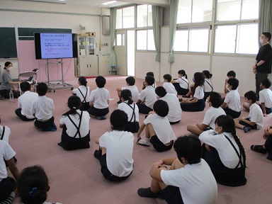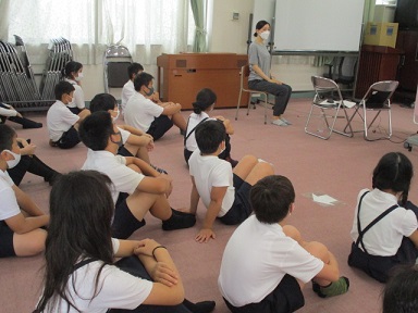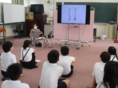 6年生が保健の学習で、発育測定の前に「よい姿勢」について養護教諭の先生のお話を聞いていました。背骨のS字カーブのことや座骨を床に突き刺すようなイメージで座ることがよい姿勢につながることを知りました。