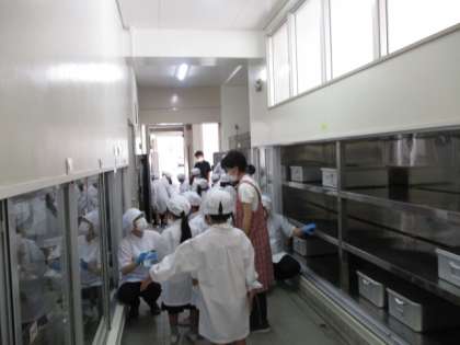 2学期の給食が始まりました!久しぶりの給食。こども達も楽しみにしていたようで、給食室に入る前からわくわくしています!クラスといただきますを大きな声で言って、調理員さんから食器カゴ、牛乳、パン箱、食缶を受けとります。