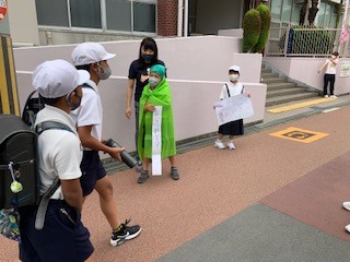 9月7日(水)今朝も学校の玄関では、代表委員の児童が元気な声で登校してきた子どもたちに「おはようございます!」とあいさつをしていました。