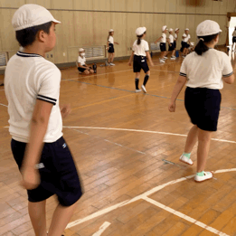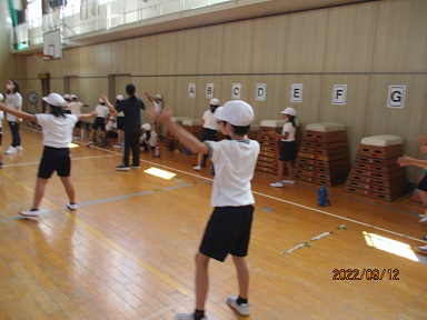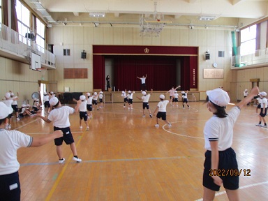 3年生が講堂で、運動会の団体演技の練習をしていました。