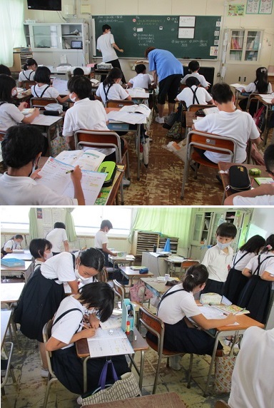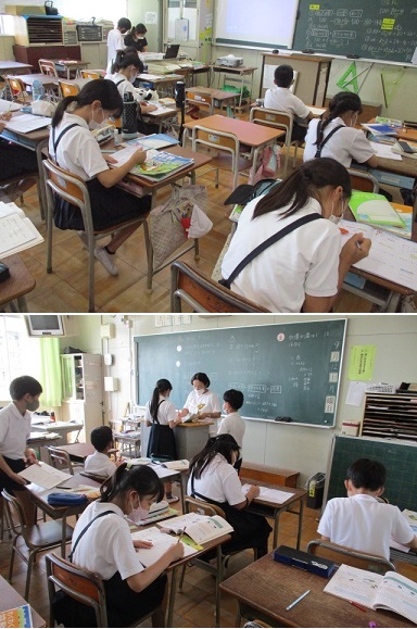 4年生が算数科の学習で、「ひとまとまりとみられるものを( )を使って、一つの式に書こう」というめあてで、たし算やひき算、かけ算、わり算の入り混じった計算に取り組んでいました。