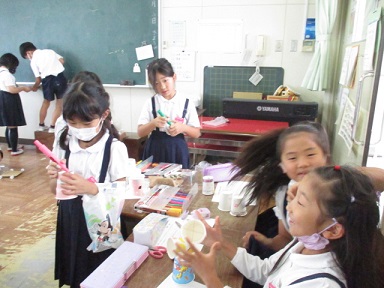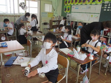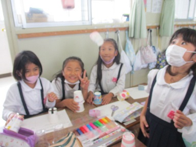 2年生が生活科「うごくうごくわたしのおもちゃ」の学習をしていました。紙コップなどにゴムなどをつけて、跳ばしたり転がしたりして、わたしのおもちゃを作っていました。どうすればもっとうまく動くか考え、友だちとともに工夫していました。