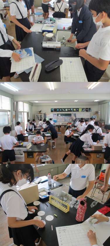 食塩水、炭酸水、うすい塩酸、うすいアンモニア水、重曹水、さとう水、小麦粉水、水の8種類の水溶液を見分ける実験をしました。各班ごとに自分たちで実験方法を考え、話し合い、実験していました。6年生らしくどの班も建設的な話し合い活動でした。