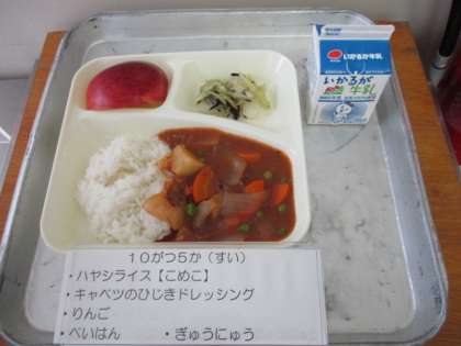 本日のハヤシライスは、小麦粉の代わりに米粉を使っています。小麦アレルギーの児童も安心して食べられる献立です。