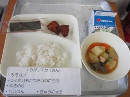 今日は、愛知県の郷土料理「みそカツ」です。下味をつけた豚肉に、衣、パン粉の順につけて揚げます。八丁みそ、赤みそ、砂糖、みりんに湯を少しずつ加えて煮、水ときでんぷんでとろみをつけ、配缶時にかけます。八丁みそのコクと旨みが揚げたてのカツと、よくからんで味がじゅわーっとでてきます。放送では、愛知弁クイズをしました。