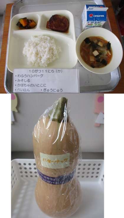 調理員さんが、ひょうたん型の珍しいかぼちゃを持ってきてくださいました。南アメリカ誕生した「バターナッツかぼちゃ」です!バターのようになめらかで、ナッツのように甘いことから、この名前がついたそうです。