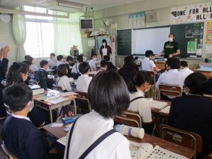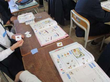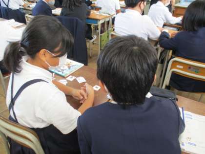 6年生が英語で好きなものや欲しいものを伝える言い方を学習しました。「l like 〜」や「I want 〜」を使って、いろいろな言い方を練習しました。歌で練習したあと、英語の書いたカードを見ながらペアで言い合っていました。楽しく活動することができました。
