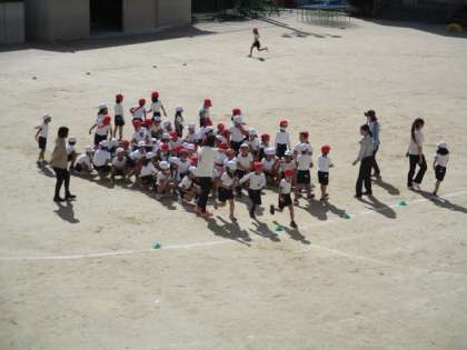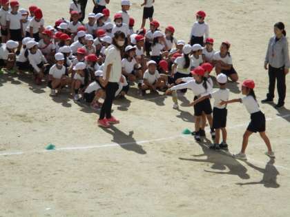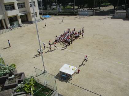 2年生が3クラス合同で「リレーあそび」を行いました。各クラス赤・白で6チームに分かれて、1人1週ずつ走ってバトンをつないでいきます。一生懸命走っていました。