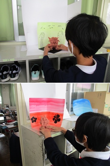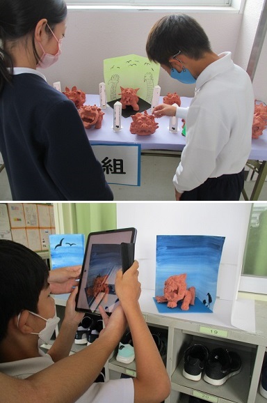 5年生が粘土で作ったシーサーと、その背景の南国の景色の絵を合わせて、撮影会をしていました。どれも個性的なシーサーの顔と、沖縄らしい風景がうまくマッチングして楽しそうでした。
