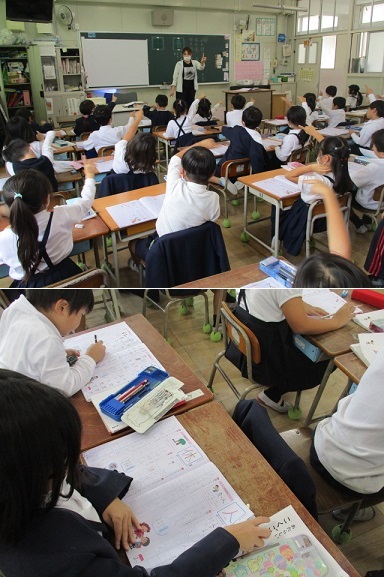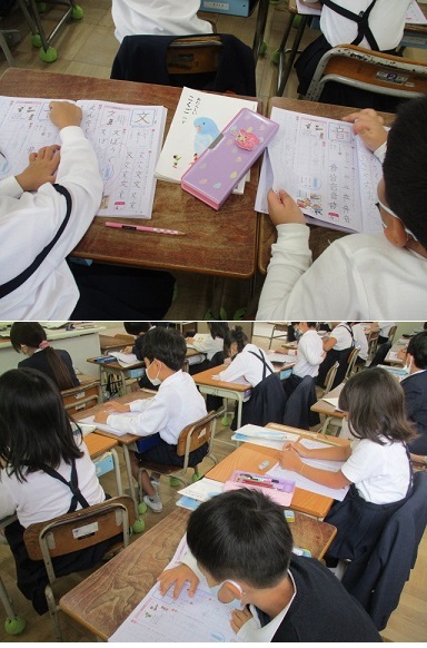 1年生がかき方の学習で、「音・人」の漢字について考えていました。