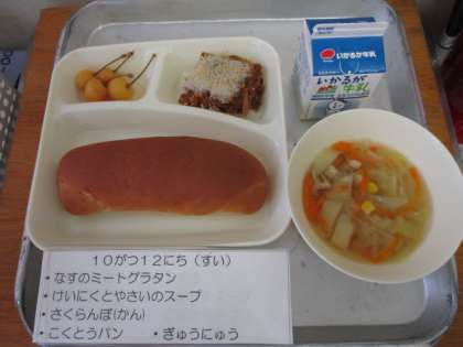 本日は、山形産のさくらんぼの缶詰です。給食では、着色料を使用していないので白い色をしています。1年生の教室に行くと、「赤いのと同じ味?」と食べるのに躊躇していましたが、食べたら「美味しい♪」とニッコリ笑顔になっていました。