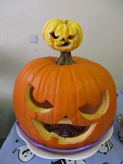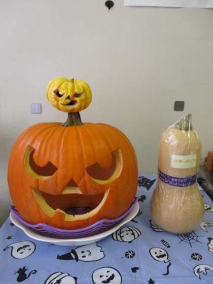 実は、調理員さんの手作りなんです!!「すごい!」「天才!」給食室では、まるで美術館の作品を観るかのように、みんな目を丸くして、のぞきこんだり、拍手や歓声があがり大喜びでした。昨日のバターナッツかぼちゃも並べて、かぼちゃ祭りです♪調理員さんに感謝です。