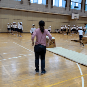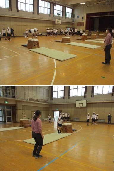 開脚とびで、安定した跳び越しと着地ができるように何度も練習をしていました。