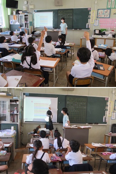 10枚ずつ10段に並んだ葉っぱの数え方を考え、みんなの前で自分なりの数え方を発表していました。