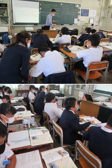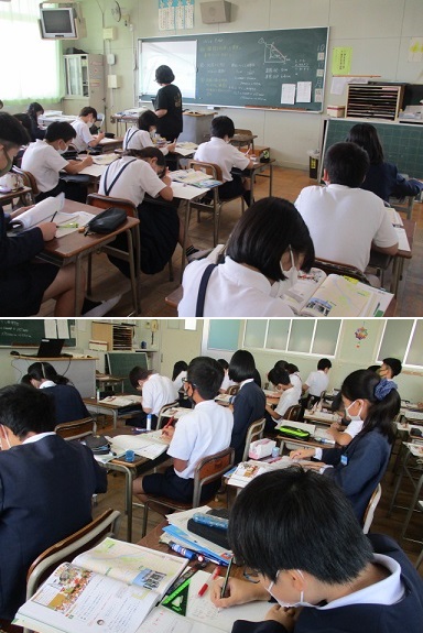 実際の長さを1000分の1に縮小した図形(縮図)を描き、その長さを測って実際の長さを求める学習で、習熟度別のグループごとに熱心に取り組んでいました。