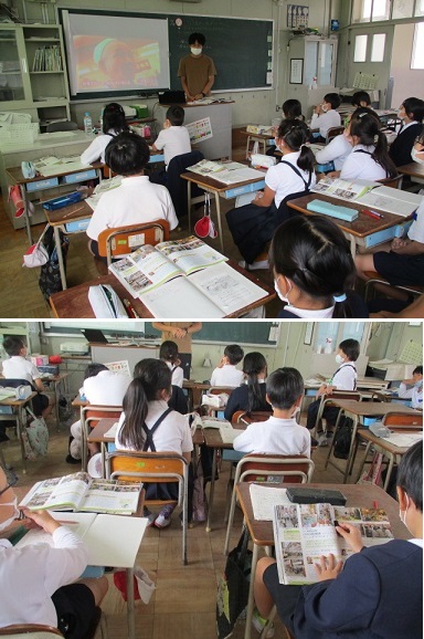 3年生が社会科の時間に、商店街にある店の人が商品を売るために工夫していることを考えていました。商店街の方のインタビュー動画も視聴し、参考にしていました。