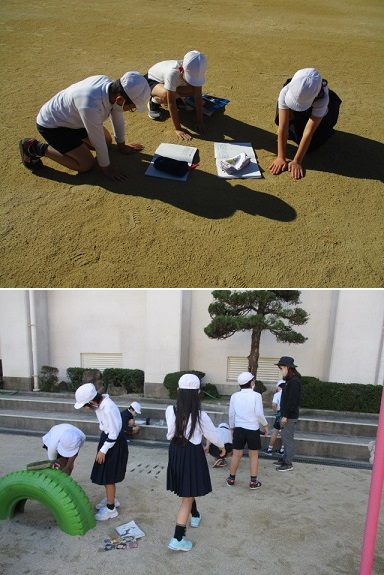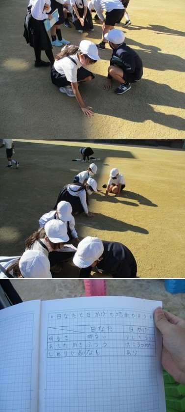 3年生が理科の学習時間に、運動場で「日なたと日かげ」の様子のちがいについて調べていました。