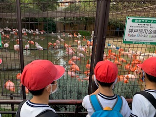 動物園に入ると学級ごとに、まずはたくさんのフラミンゴを見ました。そのあと、木に登ったコアラやレッサーパンダ、大きなゾウなどを見ました。