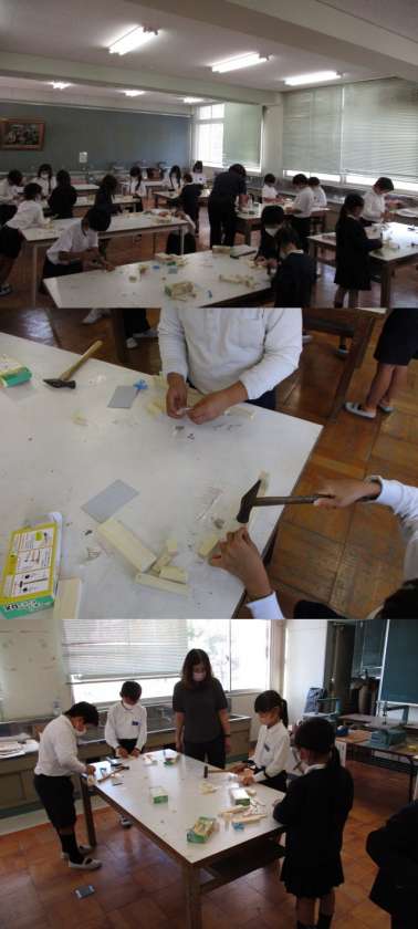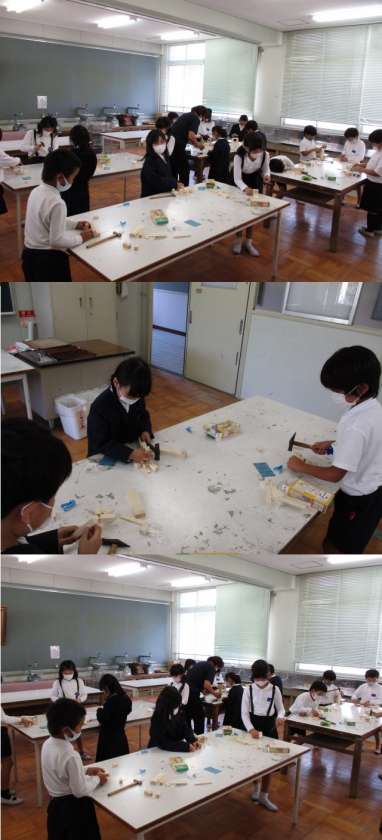 3年生が図画工作科の時間に「くぎうちトントン」をしていました。