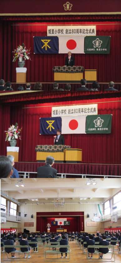 開式のことば、国歌、大阪市歌斉唱の後は、学校長式辞、記念事業委員長あいさつ、PTA会長挨拶と続きます。