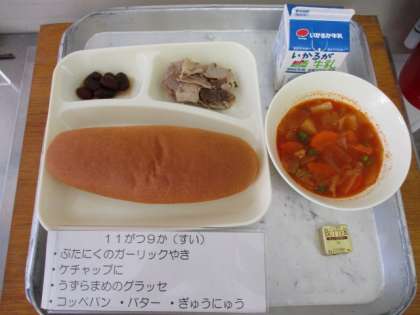 本日は、うずら豆のグラッセです。グラッセとは、つやを出したり、砂糖で煮込むことです。本日は、オリーブ油でつやをだしています。うずら豆は鳥のうずらの卵によく似ていることから、その名前がつきました。成長にかかせない亜鉛やビタミンB2、食物繊維が豊富に含まれています。「今日の給食も美味しかったよ。」と感想をいってくれました。
