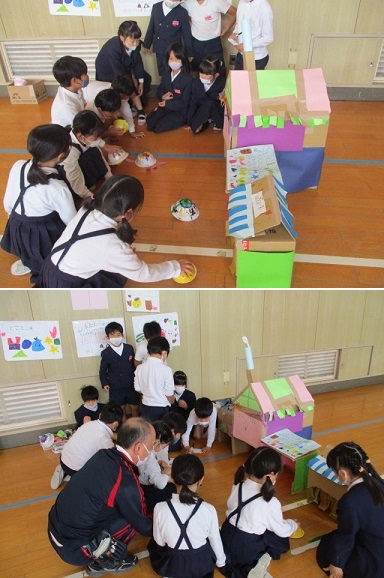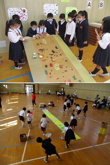 2年生が作ったおもちゃでゲームの説明など役割を分担し、1年生が楽しそうに遊んでいました。